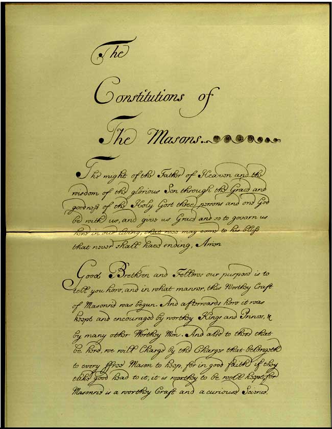 Cama Masonske konstitucije O, moći Oca Nebeskog sa mudrošću Sina slavnoga i milošću i dobrotom Duha Svetoga, tri lica i jednog Boga koji je sa nama, daj nam milost i vodi nas tako ovde u životu našem, kako bismo stekli večno blaženstvo njegovo. Amen. Dobra Braćo i prijatelji, namera nam je