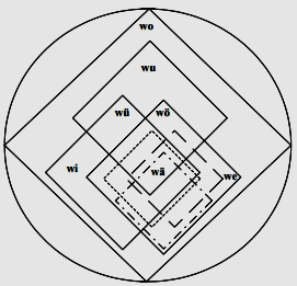 In einem Gesamtbegriff (Quadrat) wo ist links das Quadrat wi als das "Urbild der Menschheit" enthalten, welches im Folgenden dargestellt wird. Rechts befindet sich das Quadrat we, welches die Summe aller geschichtlichen Einzelheiten des gesamten heutigen Weltsystems, seiner Untersysteme bis zu den einzelnen Menschen enthält (Geschichtsbegriff). Hier wäre der Aufriß unter http://www.internetloge.de/krause/krlebenskunst.pdf als konkrete Basis einsetzbar. Die konkrete, pragmatische und komplexe Darstellung dieser Fläche we ist eine wichtige Aufgabe, wenn man das Urbild wi mit den konkreten Fakten des Weltsystems effektiv verbinden und vergleichen will. Erst nach einem solchen Vergleich kann man für die Weiterbildung des konkreten Weltsystems und aller seiner Elemente, Glieder und Teile Handlungsmuster (Musterbilder) wä erarbeiten. Die Darstellung des konkreten, derzeitigen Weltsystems erweist sich bei sorgfältiger Betrachtung, wie auch http://www.internetloge.de/krause/krlebenskunst.pdf zeigt, als äußerst schwierig. Abgesehen davon, dass die hohe Komplexität allein im Umfang kaum zu bewältigende Mengen von Daten enthält, die von einer Vielzahl von Wissenschaftern aller Disziplinen zusammen zu tragen wären, ergeben sich eine Unmenge theoretischer Probleme in der Bewertung der Faktoren, ihrer Gewichtung, in der Beurteilung wirtschaftlicher, politischer, religiöser, kultureller und sprachlicher Zusammenhänge. Nicht einmal die Frage der Evolutionsniveaus der drei Systemtypen erscheint geklärt. Wie wir sehen, gibt es eine Vielzahl von Evolutionstheorien in den drei Systemtypen, die einander widerstreiten, sich oft gegenseitig ausschließen oder heftig bekämpfen und selbst in ihrem Konflikt Grund für Spannungen sind.
